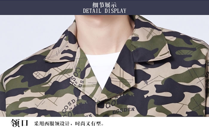 迷彩大褂工作服領(lǐng)口設(shè)計(jì):采用西服領(lǐng)設(shè)計(jì),時(shí)尚有型